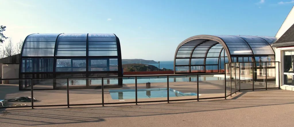 - Covered and Heated Swimming Pool: A large pool with stunning ocean views, perfect for swimming or relaxing on a sunbed.