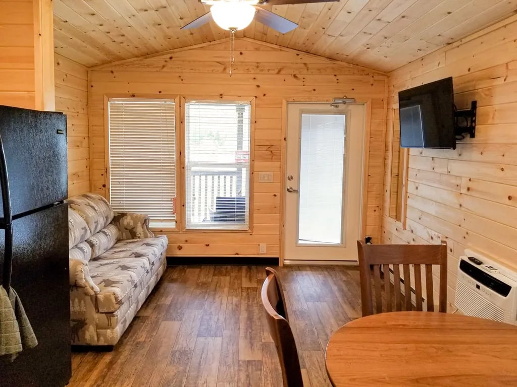 - Cozy Cabins: Our six fully-furnished cabins can comfortably sleep 4-6 guests and come equipped with heat, air conditioning, a kitchenette, dining area, and a full bathroom.
