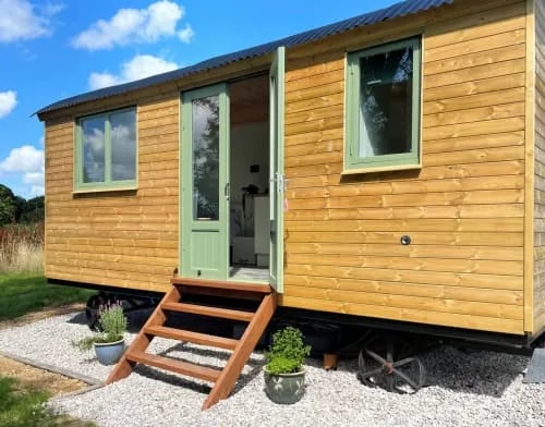 - Elderflower Shepherd’s Hut – A comfortable retreat for couples, featuring cozy bedding, solar lighting, and a private ensuite shower.